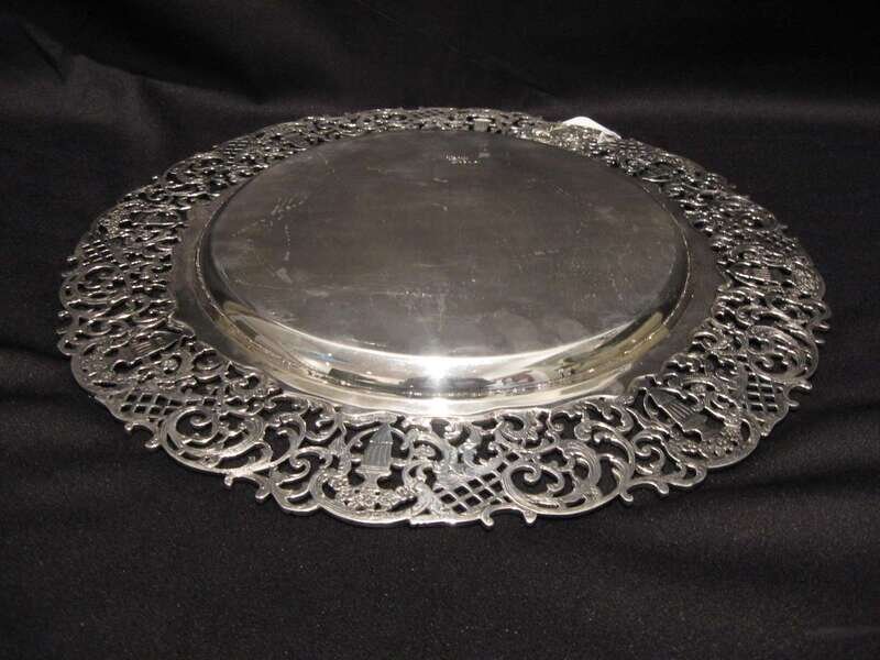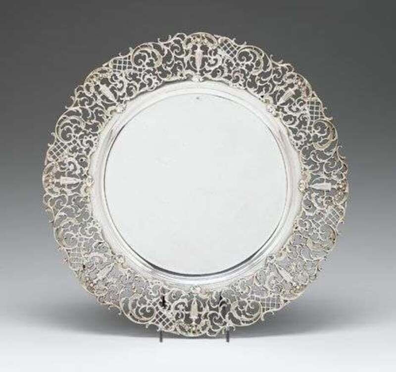 Of circular form with a wide pierced border of flower filled urns and trailing garlands.