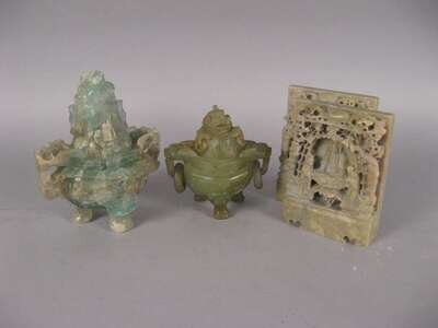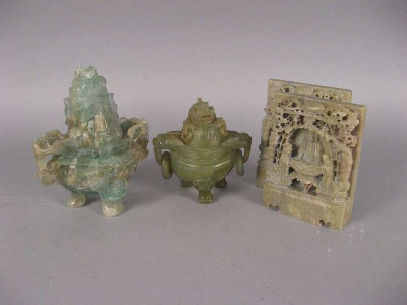 Chinese quartz censer, jadeite censer, and pair of soapstone bookends early 20th century