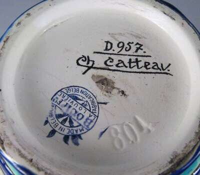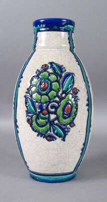 Of tapered ovoid form, with raised decoration of blue and green flowers on a crackled ground, with printed blue mark 'Made in Belgium/ Boch Frs La Louviere/ Fabrique Belge' and signed 'Ch. Catteau' and D.957'.