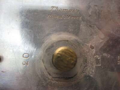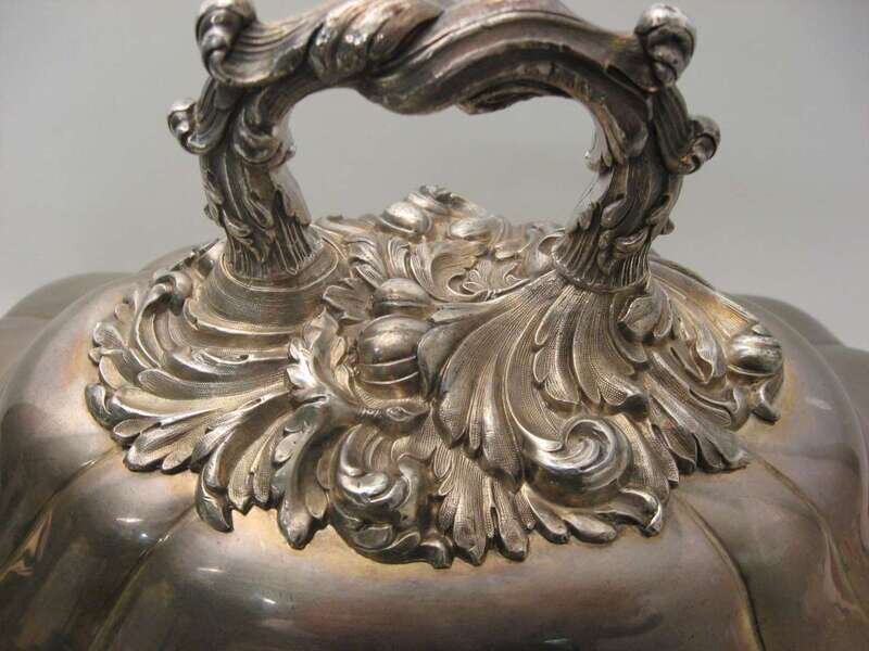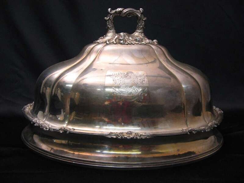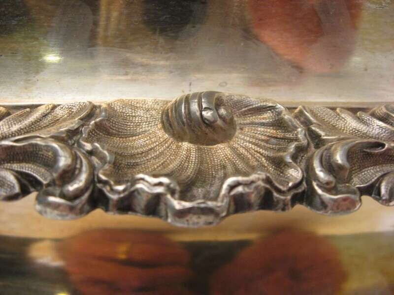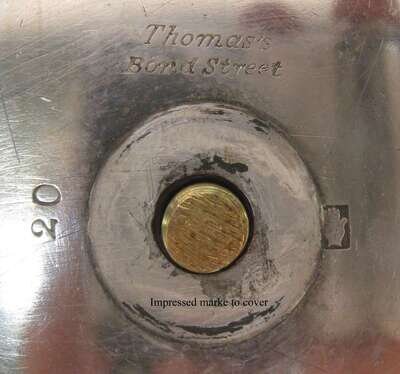 With a foliate caset handhold and rim centered by an heraldic crest, stamped with a 'hand' mark and inscribed 'JH' and 'Thomas's Bond Street'.