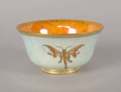 Of circular form with gilt decoration and butterflies on a white opalescent ground, orange wash to the interior, raised on a circular foot.