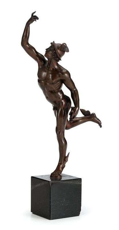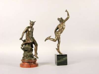 Bronze, medium brown patina; together with a spelter figure of Mercury seated. (2).