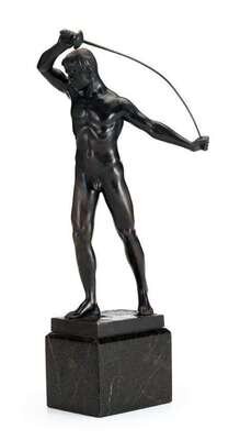 Bronze, dark brown patina, raised on a rectangular marble base, inscribed Schmidt-Felling with foundry mark 'ECHTE BRENCE'; together with a standing classical figure, with a shield strapped to his back, bronze, inscribed Schmidt-Felling, raised on an octagonal marble base. (2).