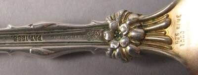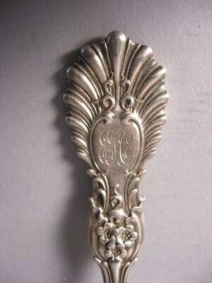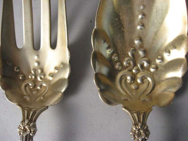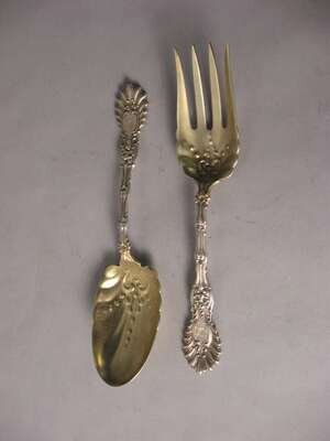 Comprising a salad serving fork and spoon with floral and scalloped design, monogram and impressed marks.