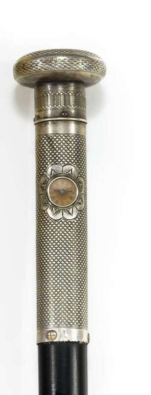 Maker's marks rubbed, the engraved shaft with a small inset circular clock face with Roman Numerals above an ebonized shaft.
