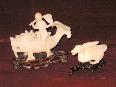 A dragon carp being ridden by child with pennant and a Mandarin goose; with custom-made wooden stands.