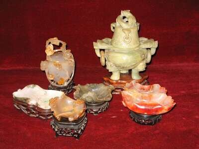 Comprising two mottled-green jadeite brushwashers in foliate form, mottled-russet hardstone double-reservoir brushwasher, well-carved agate brushwasher in foliate form, reticulated agate covered vase and large covered jadeite tripod censer; all with wooden stands.