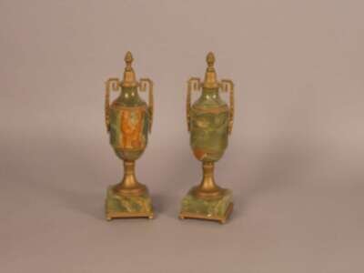 Each of baluster form with two square handles to the sides raised on a square socle. (2).