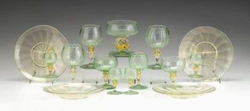 Comprising 18 water glasses, 22 red wine glasses, 18 white wine glasses, 20 cordial glasses, 19 liqueur glasses, 2 sweet meat dishes with dolphin stems, and 14 dessert plates. .