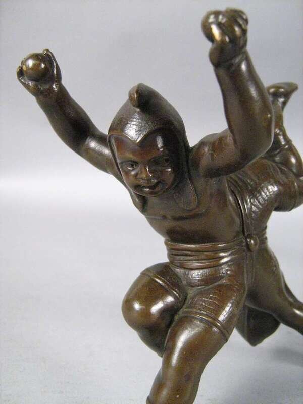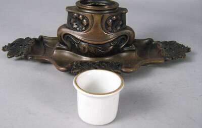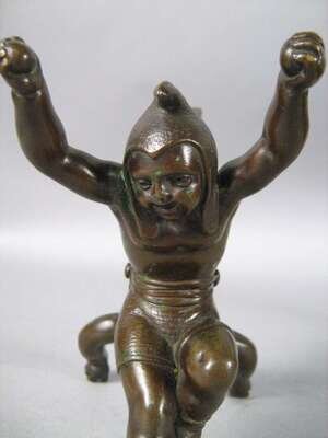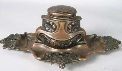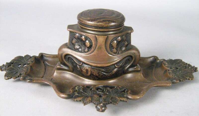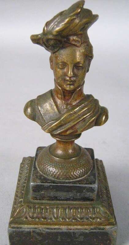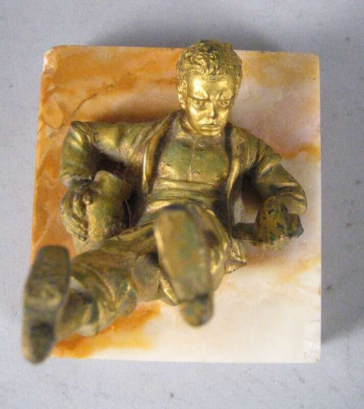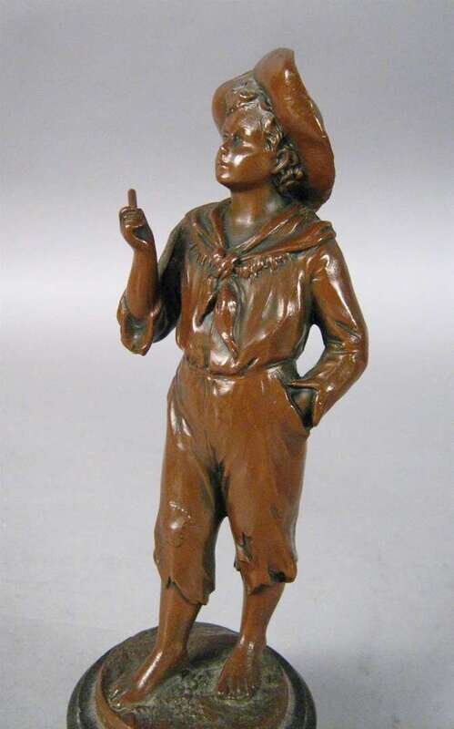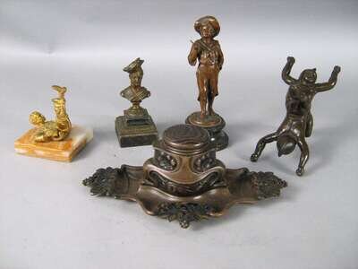 Comprising a bronze bust of a woman in a plumed hat raised on a square base, a gilt metal figure of a boy fallen over, a figure of Huckleberry Finn, a bronze character group of toppling over figures; together with a bronze inkwell cast with foliate designs and fish. (5).