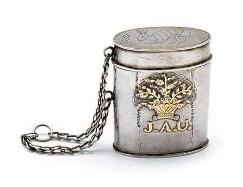 Flattened cylinder form with applied decoration of a flower filled basket and monogram 'M.G.U', the reverse similarly decorated and with monogram 'J.A.U', the cover with a punched figure of a rabbit.