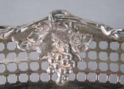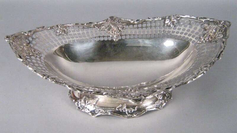 Of shaped oval form with a pierced edge decorated with trailing grape vines and bunches of grapes raised on a shaped foot.