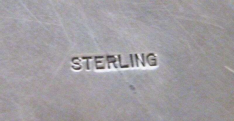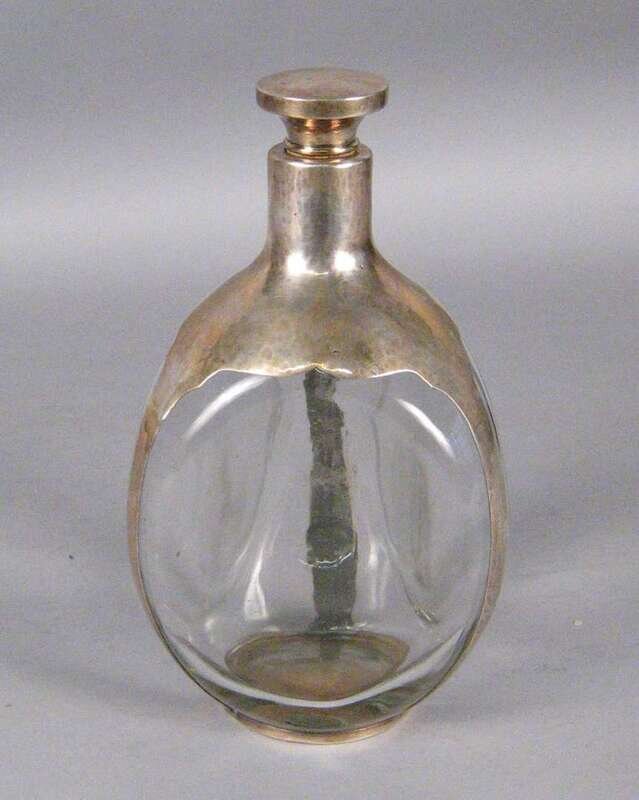 The triangular glass decanter with impressed sides and hammered sterling silver overlay and stopper, the glass monogrammed VHB.