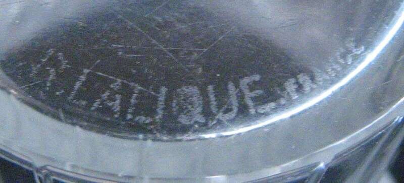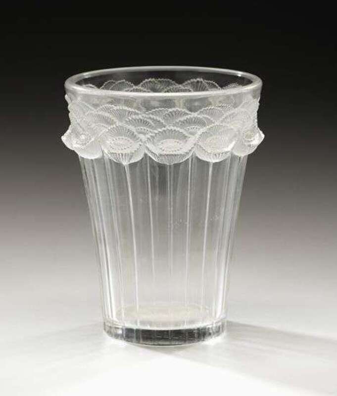 Of tapered form with reeded vertical stems below relief molded flowerheads, inscribed on the underside 'R. Lalique France'.