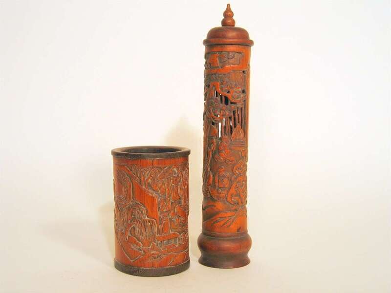 The cylindrical brushpot is carved in low relief to show a sampan and mountainous riverscape, hardwood rim and circular base, together with a reticulated open work carved covered bamboo stick holder.