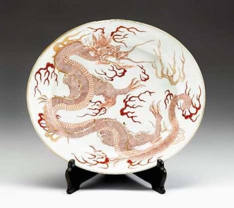 Japanese iron-red decorated porcelain 'dragon' platter six character marks to base, late 19th century