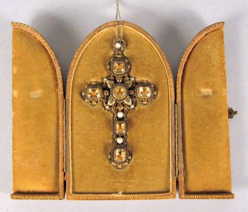 with faceted glass insets backed by yellow gold foil simulating topaz and pearls hanging from a thin white metal link chain.