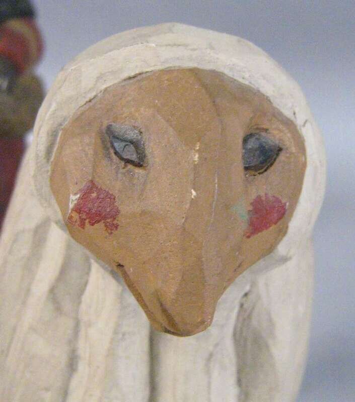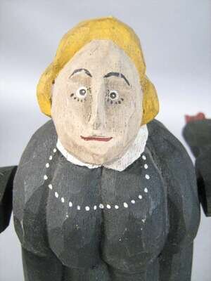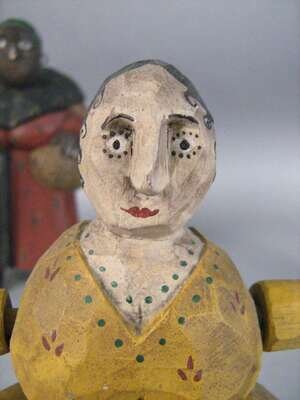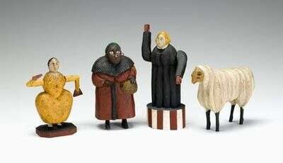 Comprising a woman in a red dress, a woman in a black dress with spinning arms raised on a red, white and blue base, a woman in a yellow dress with spinning arms and a sheep.