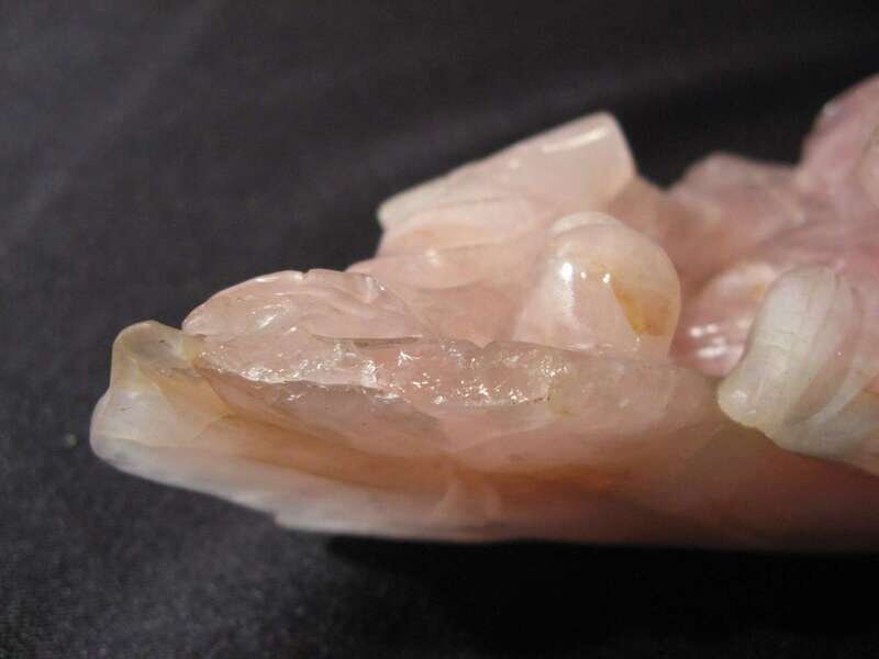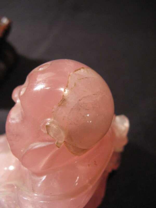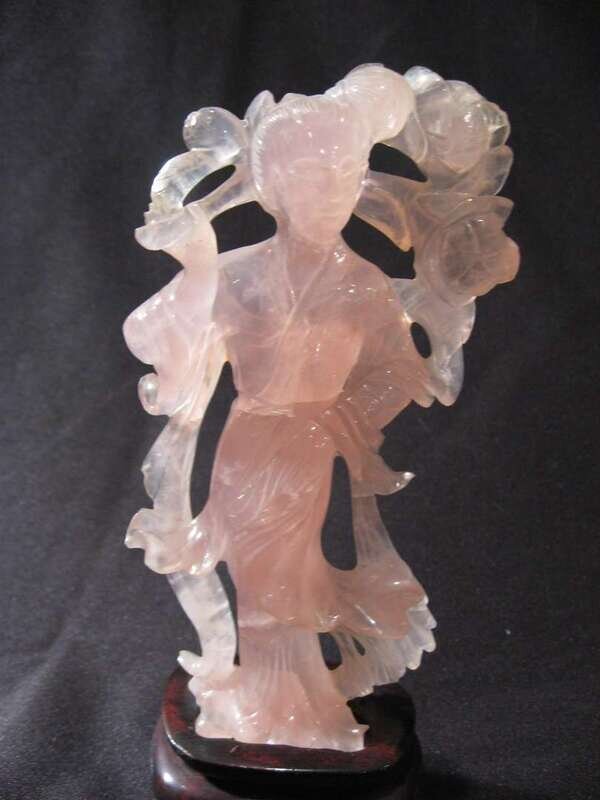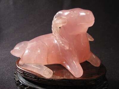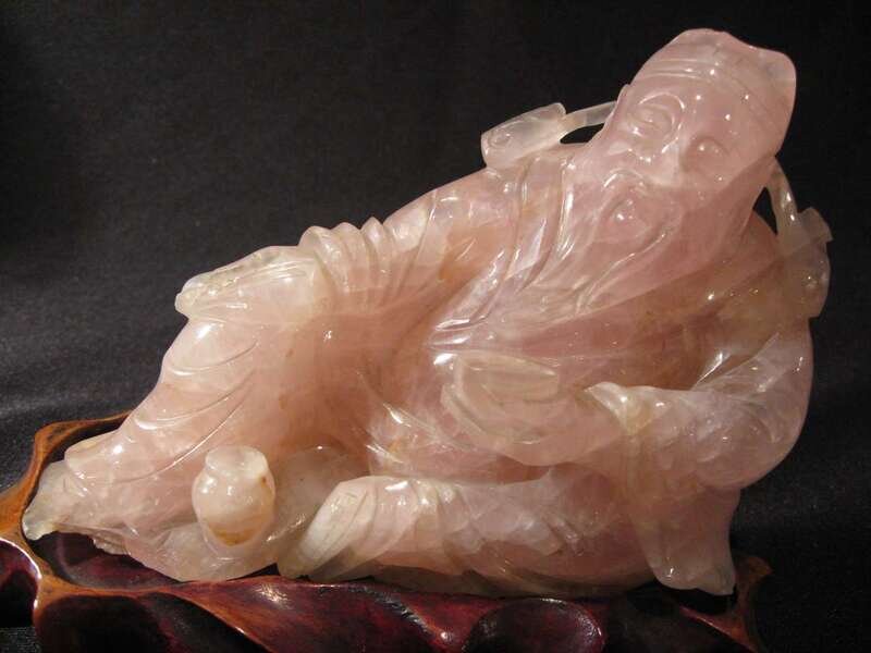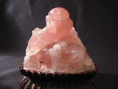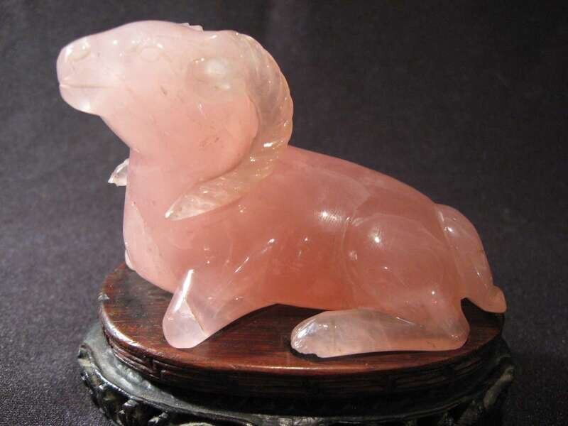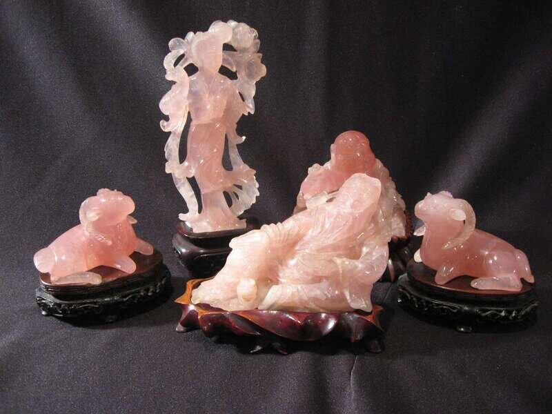 Comprising a Taoist figure (perhaps Laozi), Budai with Fu Lion, Quanyin holding rose garland and pair of kneeling rams; each with custom-made wooden stand.
