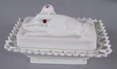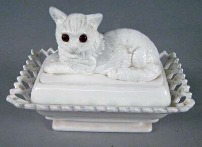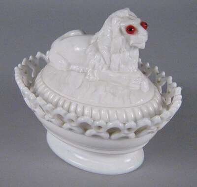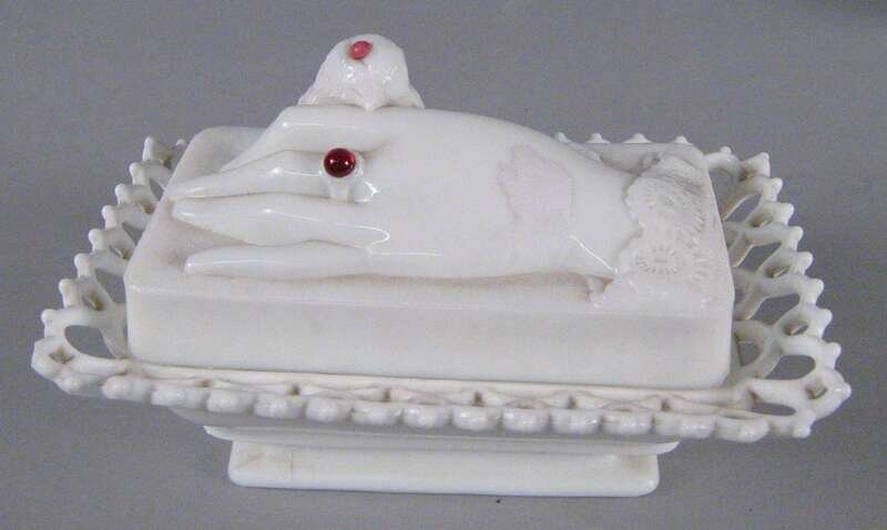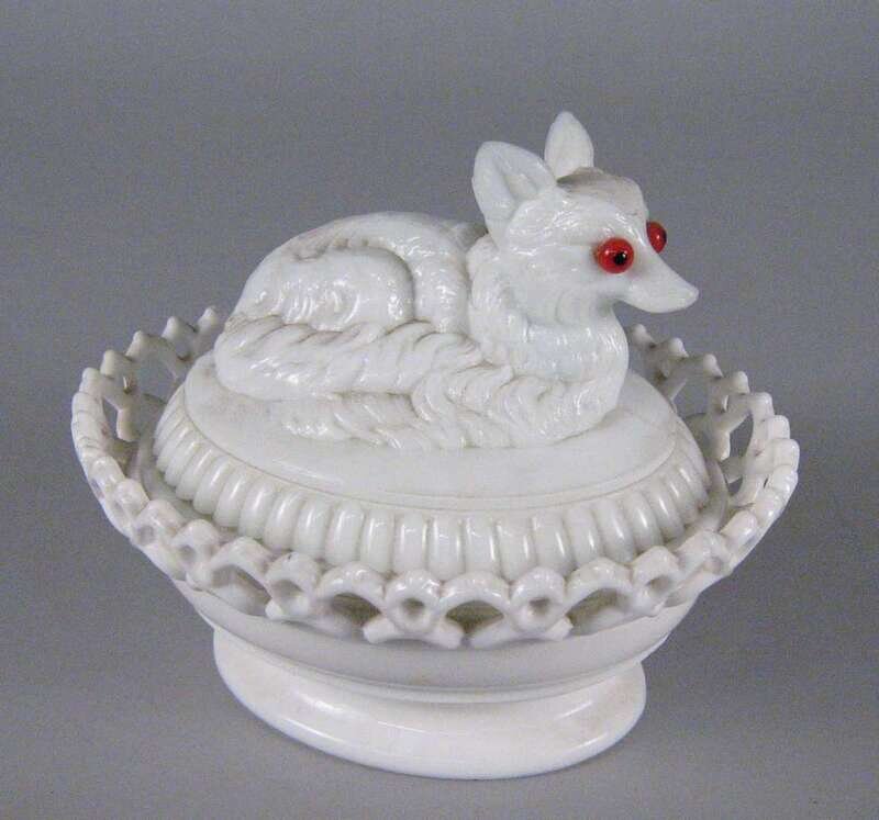 Of rounded, rectangular and oval shape with lacy edge and figural lids, including a fox, lion, cat, chick with eggs and a hand holding a dove, each embellished with glass eyes. all marked "Pat. Aug 6, 1889".