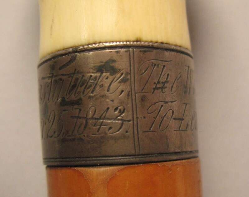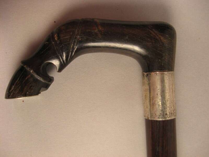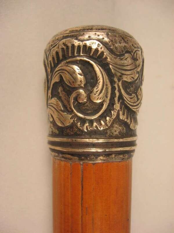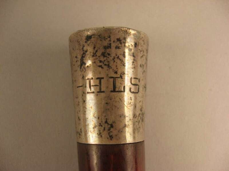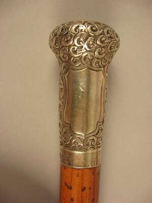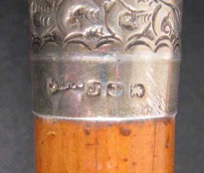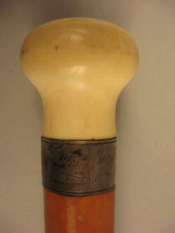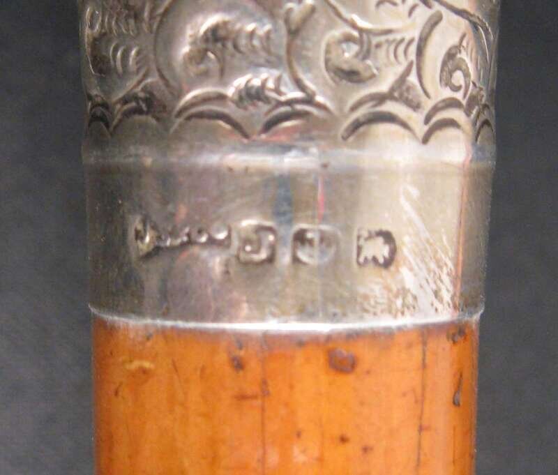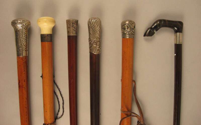 Comprising a horse's hoof shaped stick with a Birmingham, 1908 sterling silver collar, an unmarked silver capped stick with repousse decoration of putti and c-scrolls, an unmarked silver banded and ivory stick with inscription 'The Whig Members of the Legislature/ To Lewis Bradford Esq. Mar. 25, 1843; a repousse mounted silver stick with unidentified marks of a 'J' an upside down umbrella and a buffalo and 'JS&Co.' ; an umarked white metal mounted stick with repousse decoration of flora and an unmarked silver capped stick with 'Canal Zone' and motto to the top. (6).