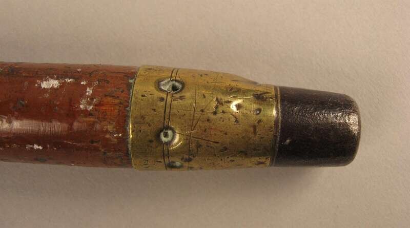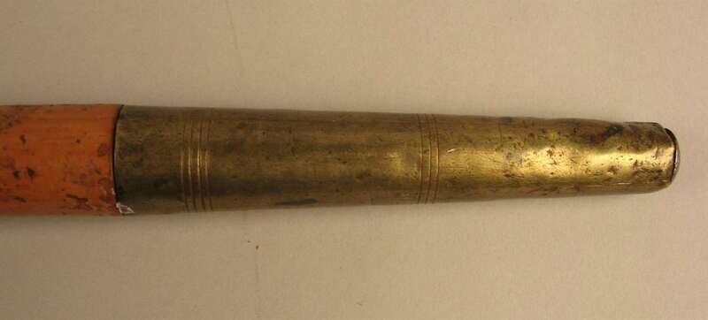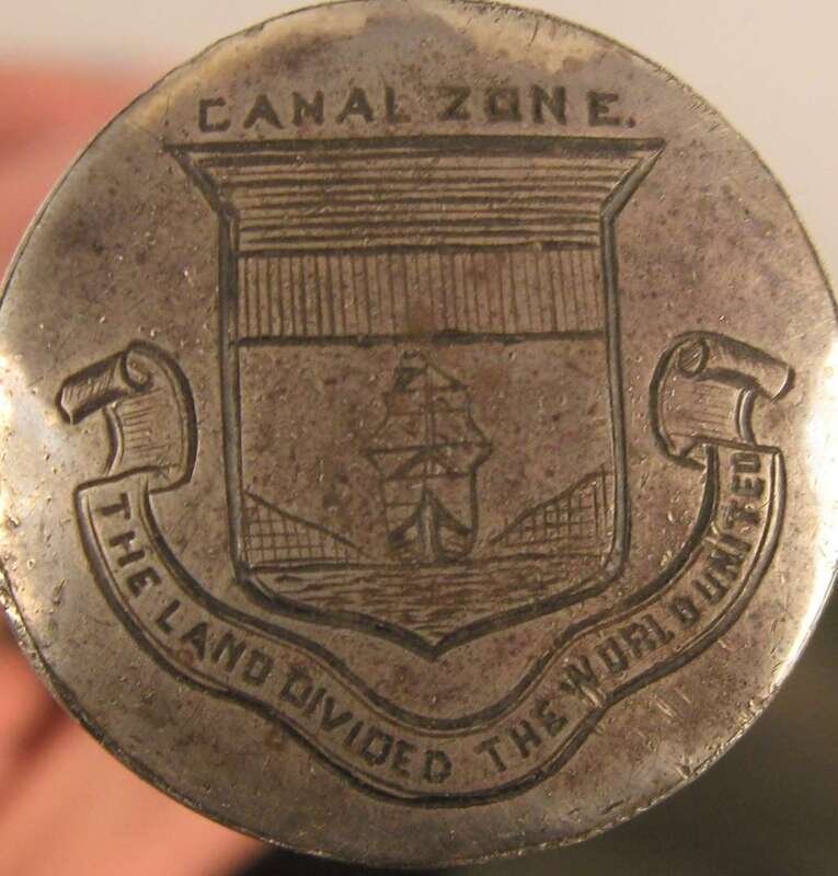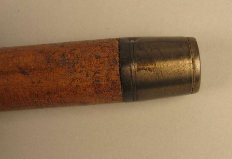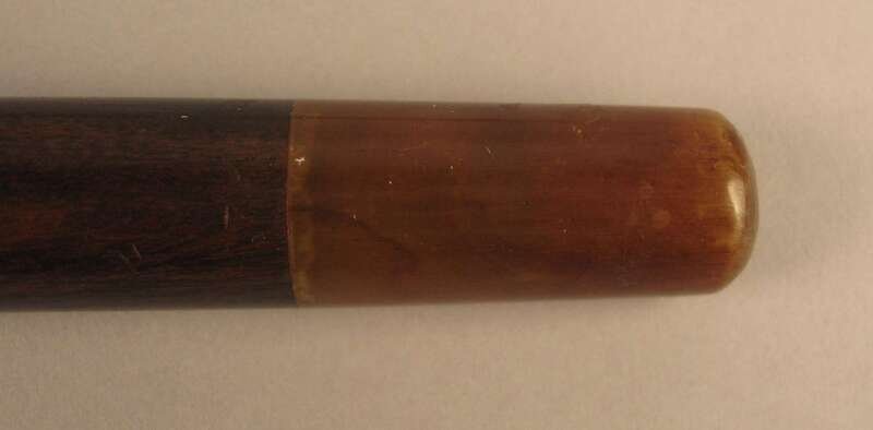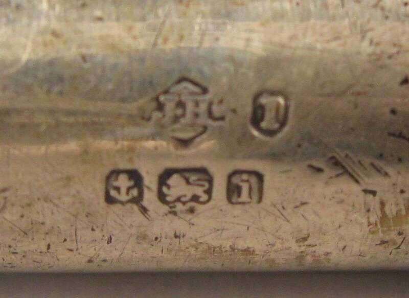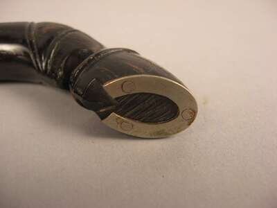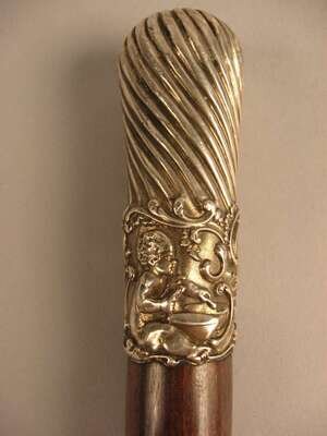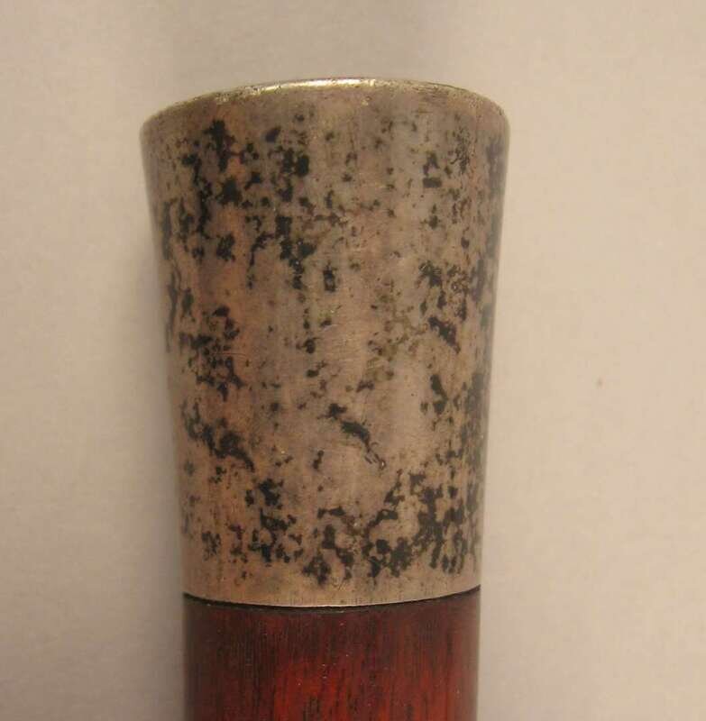 Comprising a horse's hoof shaped stick with a Birmingham, 1908 sterling silver collar, an unmarked silver capped stick with repousse decoration of putti and c-scrolls, an unmarked silver banded and ivory stick with inscription 'The Whig Members of the Legislature/ To Lewis Bradford Esq. Mar. 25, 1843; a repousse mounted silver stick with unidentified marks of a 'J' an upside down umbrella and a buffalo and 'JS&Co.' ; an umarked white metal mounted stick with repousse decoration of flora and an unmarked silver capped stick with 'Canal Zone' and motto to the top. (6).