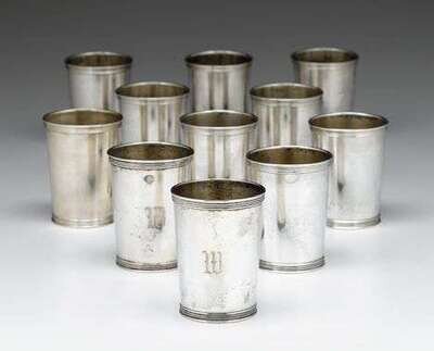 Cylindrical with reeded rims and feet, unmonogrammed; together with three associated julep cups of a similar design, monogrammed 'W'. (11).