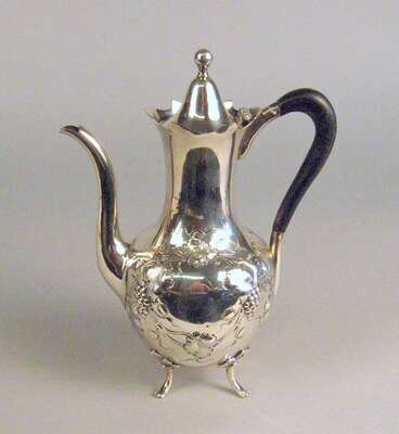 Decorated with bacchic vines with a treen handle and curved spout, unmarked, stamped 'stamped'.