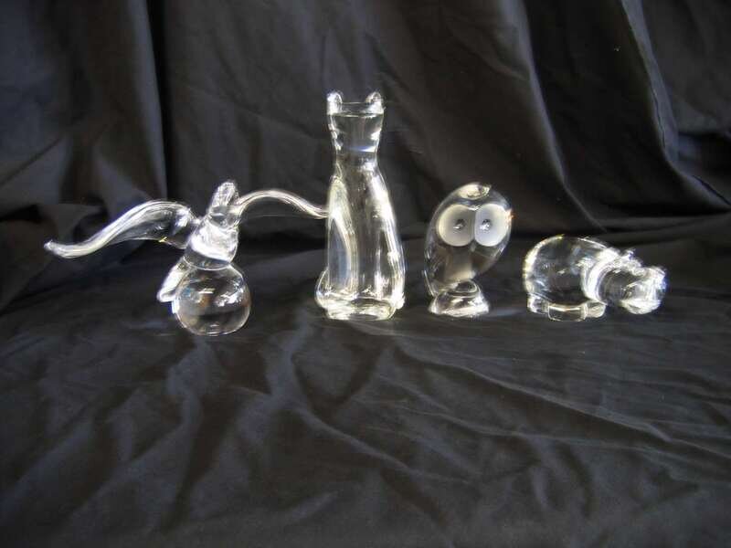 Comprising an eagle with wings extended raised on a globe (8130), a standing cat (8102), a hippopotamus (8280) and a stylized owl (8065), all with inscribed 'Steuben' to bases. (4).