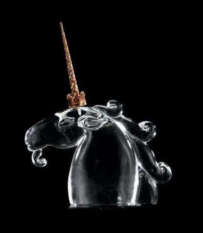 Modeled as a head of a unicorn with a crown atop his head, the crown with stamped '18K' and the underside of the glass inscribed 'Steuben'.