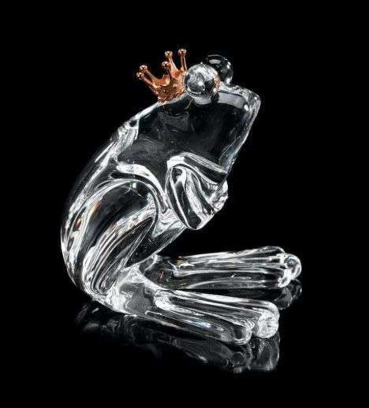 Modeled as a seated frog with a yellow gold crown atop his head, the glass inscribed 'Steuben'.