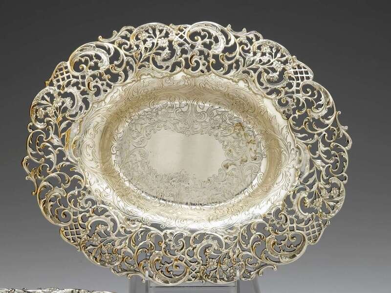 Of shaped oval form with a pierced wide rim of foliage and c-scrolls, the center engraved with a geometric design.