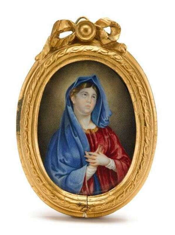 Oval, painted on ivorine, depicting Mary wearing a blue cloak, in a giltwood frame with ribbon tied cresting.