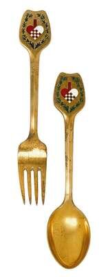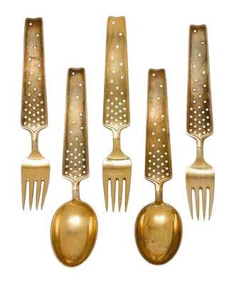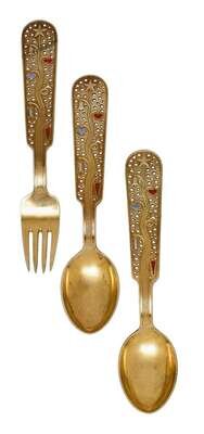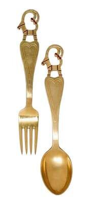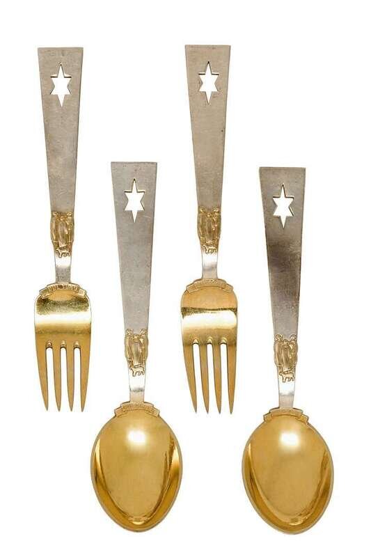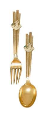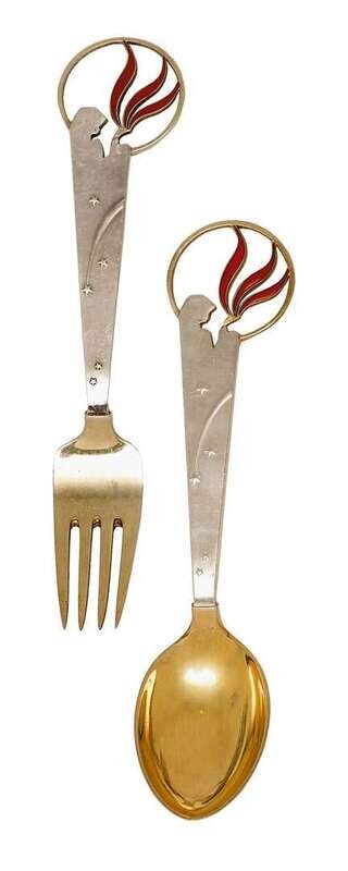 Comprising 'The Little Match Girl' spoon and fork designed by LB Lunding, 1933; 'The Gift Laden Christmas Tree' two spoons and fork designed by Olaf Staehr-Nielsen, 1939; 'The Star of Bethlehem' two spoons and two forks designed by Paul Erlinger, 1940; 'Dove of Peace' spoon and fork designed by Olaf Staehr-Nielsen, 1943; 'Falling Snowflakes' 3 forks and 2 spoons designed by Ibi Trier Morch, 1947; 'Christmas Ram' spoon and fork designed by Ilse Nalbandian, 1948; 'Colorful Christmas' spoon and for designed by Eigil Jensen, 1951; 'Winter Solstice' spoon and fork designed by Rolf Middelboe, 1960; 'Madonna and Child' two spoons and two forks designed by Carl R. Fredericksen, 1962; 'Orion' spoon and fork designed by Inger Hanmann, 1964; 'Splender of Yule' spoon and fork designed by Paul Rene Gaugin, 1967 and 'Solstice & Family' spoon and fork designed by Ib Sprang Olsen, 1973. (32).