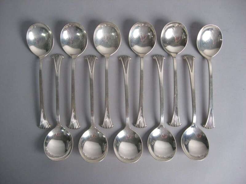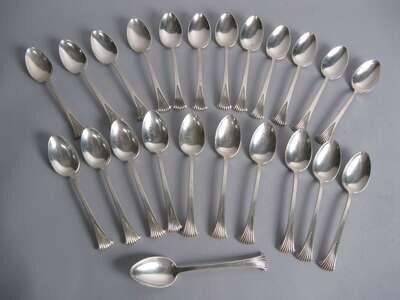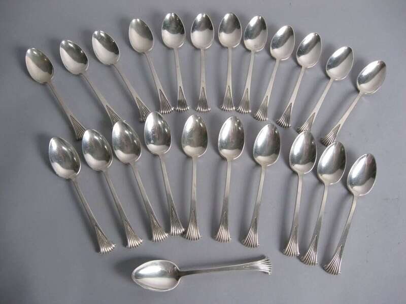 Comprising 12 dinner knives, 12 dinner forks, 12 salad forks, 24 teaspoons, 12 soup spoons, 12 cocktail forks, 12 butter spreaders, a sugar spoon, a cold meat fork, three serving spoons and a gravy ladle in fitted case on stand. (102).