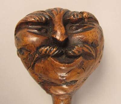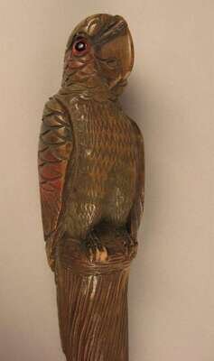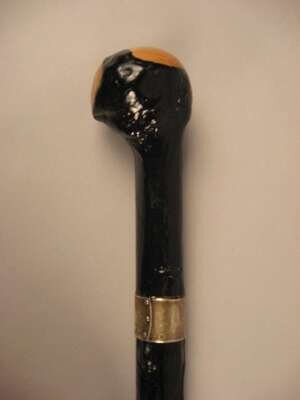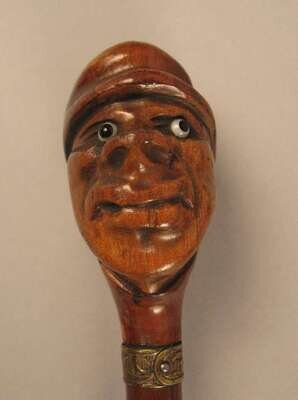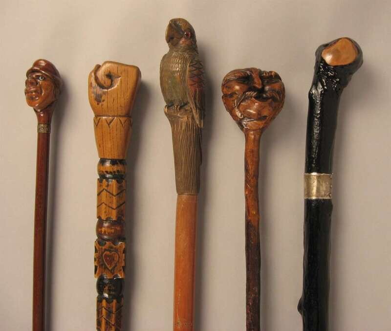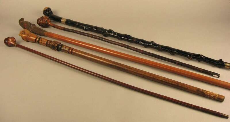 Comprising a stick with a knop carved as a mustached man, a carved a painted stick with the knop carved as a clenched fist, another stick with a carved knop of an african-american man, a stick with a knop carved as a parrot and an ebonized stick with a silver collar. (5).