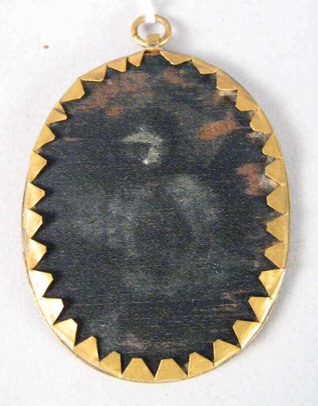 Oval, painted on ivory, the woman dressed in a white ruffled dress.