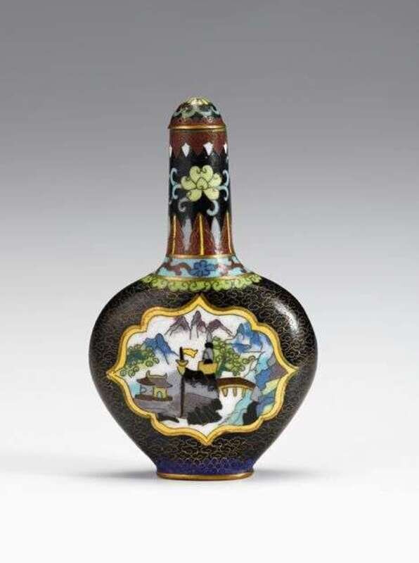 Of pear shape, domed cover over long neck issuing from a shouldered body, enameled to show leaf diaper to neck, landscape cartouche to body in reverse over a gilt-wire decorated black ground body.