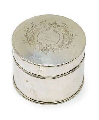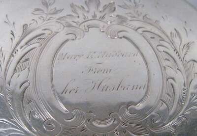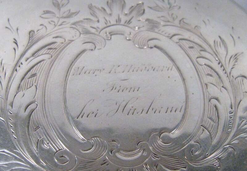 Of cylinder form, the lid with etched foliage and c-scrolls surrounding the inscription 'Mary K. Hubbard/ From/ Her Husband'.