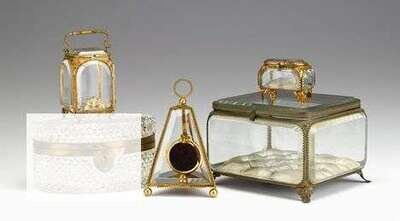 Comrising a large box with beveled glass sides and an upholstered base, a pyramid shaped box with watch holder, a small box with painted scene of Paris and a rectangular box with foliate cast gilt metal mounts. (4).