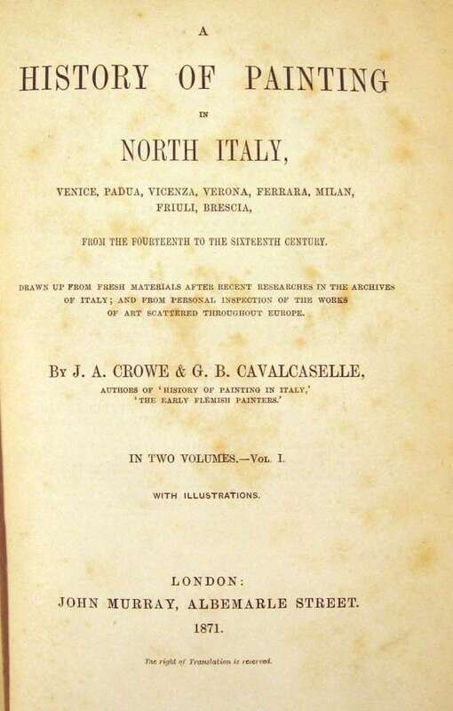 Crowe, J.A.; Cavalcaselle, G.B. A History of Painting in North Italy,..., from The Fourteenth to The Sixteenth Century. London: John Murray, 1871. First edition. 8vo, orig. green cloth, gilt, gilt-lettered spine, edges untrimmed. With 62 plates. Scattered light foxing.