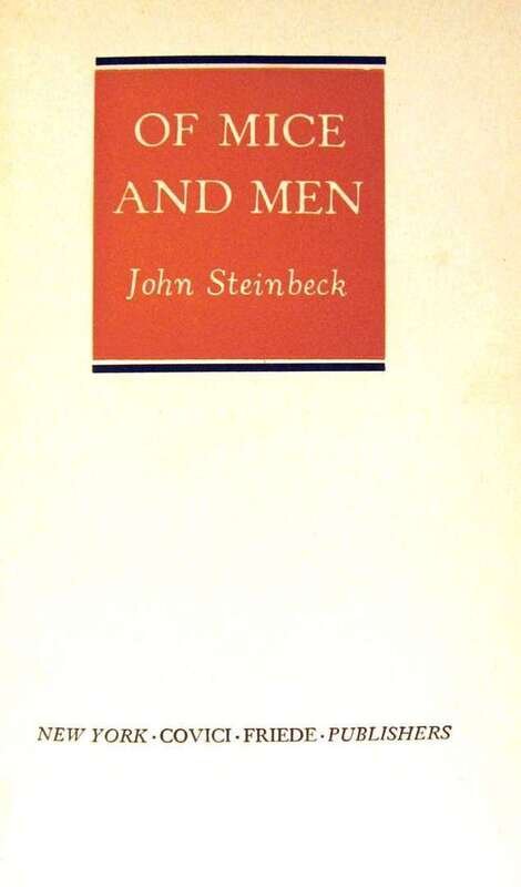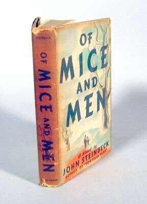 Steinbeck, John. Of Mice and Men. New York: Covici Friede, (1937). First edition, first issue. 12mo, orig. orange, white & black stamped grey cloth, top edge stained olive-grey; light edge wear, occasional spotting, d/j (minor chipping at corners & spine ends, flap joints discolored). Some, generally light, spotting & dust soiling to endpapers, minor spotting to fore-edge. Bookplate on front paste-down. With the bullet between the 8s on p. 88 & with "pendula" on line 21 of p. 9.