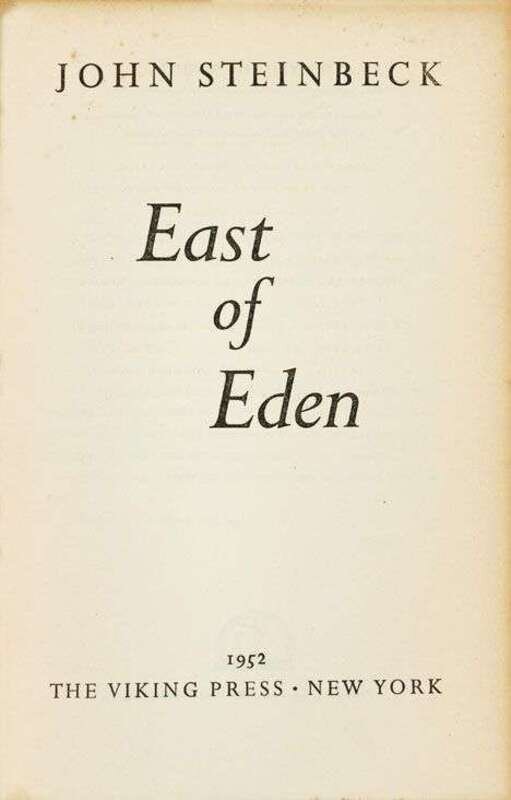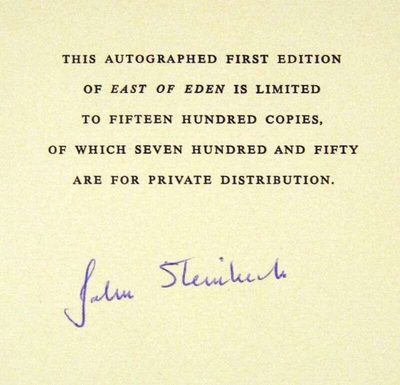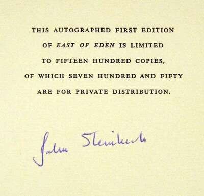 Steinbeck, John. East of Eden. New York: Viking, 1952. First edition. 1/1500 signed by Steinbeck. 8vo, orig. gilt-lettered green cloth; light edge wear. Lacking glassine d/j & slipcase.