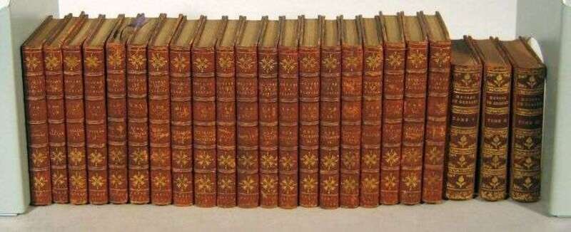 (Leather Bindings.) French Authors: Florian, (Jean Pierre Claris) de. Ouvres. Paris: Didot, 1786-An XI (1803). 20 vols. 16mo, contemp. full polished brown tree calf, gilt, gilt-paneled spines, inner dentelles gilt, a.e.g.; occasionally scuffed, spine & spine ends occasionally rubbed, front hinge of vol. 5 repaired. Numerous copper engraved plates. Internally generally clean. Vols. 1-17, 20-22. * Gresset (Jean Baptiste Louis). Oeuvres. Paris: A Boulland, 1824. 3 vols. 32mo, later full tree calf, gilt-paneled spines, silked endpapers; occasionally scuffed, silked endpapers defective in vol. 3. Frontis. & plate in vol. 1, frontis. in vol. 2.