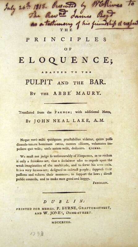 Americana - Material relating to the American South & Civil War, Naval Subjects & C - Includes autograph material: (Rives, William Cabell.) Maury, Abbe. The Principles of Eloquence... Pulpit and The Bar. Dublin, 1798. 8vo, contemp. tree calf, re-backed. Some internal dampstaining. With inscribed, dated, "July 26, 1818, " & signed gift presentation by W.C. Rives (1793-1868, Virginia political leader). * Mason, Emily V. The Southern Poems of The War. Baltimore: J. Murphy, 1867. 12mo, orig. terra-cotta cloth, gilt; scuffed, corners & edges bumped & frayed. Some internal spotting. * Cooke, Philip St. Geo. Cavalry Tactics, or Regulations for Instruction, Formation and Movements of The Cavalry of The Army and Volunteers of The United States. Washington: G.P.O., 1862. 24mo, orig. cloth. Moderately soiled & dampstained. With ownership signature of Civil War era Union soldier. * Document Signed. Forrestal, James. Washington, July 31, 1946. * 1827 American Naval letter, signed by Commodore Rogers. * 18th-Century ms. debt document, Montreal, 1761.