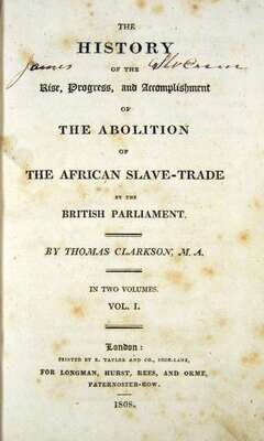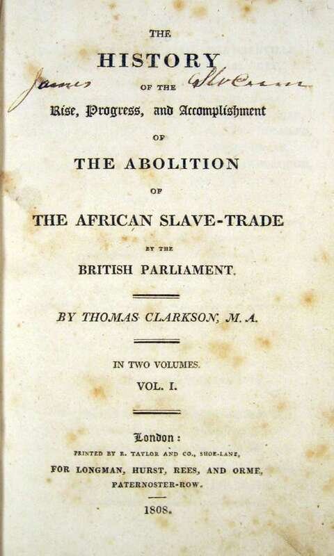 Clarkson, Thomas. The History of The Rise, Progress and Accomplishment of The Abolition of The African Slave Trade by The British Parliament. London, 1808. First edition. 8vo, contemp. 1/2 calf & bds., spine gilt, black morocco spine labels; rather scuffed, extremities rubbed, joints tender, spine ends rubbed away. Fold. plate, lacking fold. plan of slave ship. Light to moderate scattered foxing.