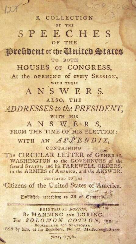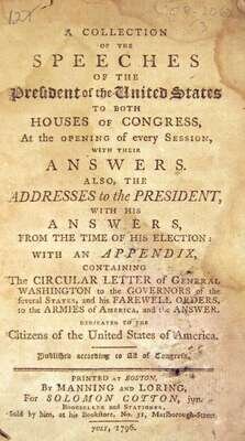 (United States.) A Collection of The Speeches of The President of United States to Both Houses of Congress, at The Opening of Every Session... An Appendix, Containing the Circular Letters of General Washington to The Governors of The Several States, and His Farewell Orders to The Armies of America... Boston: Manning and Loring, 1796. 8vo, contemp. calf; worn & defective, front cover gone. Spotting & dampstaining. With the 3 pp. list of subscribers.