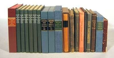 Taylor, Joseph H.: Sketches of Frontier and Indian Life on the Upper Missouri and Great Plains. Pottstown, Pa: printed & pub. by the author, 1889. 1st ed. 8vo, modern 3/4 brown morocco. Frontis. & plates; some browning and dampstaining to text. Howes T-68. * Another copy of the preceding, 1st ed. 8vo, orig. 1/2 red morocco & marbled bds. With custom box; front cover detaching, wear to corners & edges of spine. Frontis. & plates. Howes T-68. * Another copy of the preceding, 1st ed. 8vo, orig. 1/2 red morocco, custom box; some chipping to edges of spine & corners. Frontis. & plates; scrawling to front & back end papers and verso of frontis; some dampstaining and browning to text. Howes T-68. * Another copy of the preceding, 1st ed. 8vo, modern 1/2 calf & marbled bds., custom box. Frontis. & plates; light browning to text. Howes T-68. * Another copy of the preceding, 1st ed. 8vo; orig. 1/2 red morocco and marbled bds., custom box; scuffing to covers, chipping and rubbing to corners & spine. Frontis. & plates; front free end paper torn, half of leaf missing, internal browning and some dampstaining. Howes T-68. * Another copy of the preceding, Washburn, N.D.: printed & pub. by the author, 1895. 2nd ed. 8vo; modern 3/4 brown morocco and marbled bds., slipcase. Frontis. & plates; light browning to text. Inscribed by Joseph Taylor on front fly leaf. Howes T-68, ed. 2. * Another copy of the preceding, Bismarck, N.D.: printed & pub. by the author, 1897. 3rd ed. 8vo, orig. black cloth; fraying to hinges, corners, & spine. Frontis. & plates; browning to text. Howes T-68, 3rd ed. * Twenty Years on The Trap Line. Bismarck, N.D. & Avondale, Pa: printed & pub. by the author, 1891. 1st ed. 12mo, orig. purple machine leather; some wear to joints, corners, and spine. Vignette frontis. & plates; light browning to text. Howes T-69. * Another copy of the preceding, 1st ed. 8vo, orig. black cloth; corners worn, joints fraying, covers dusty. Vignette frontis. & plates; some browning & dampstaining to text. Howes T-69. * Kaleidoscopic Lives. Washburn, N.D.: printed & pub. by the author, 1901. 1st ed. 8vo, rebound in black cloth; fraying to spine edges & corners, damage to hinges. Frontis & plates; slight discoloration to text. Howes T-67. * Another copy of the preceding, Washburn, N.D.: printed & pub. by the author, 1902. 2nd ed. 8vo, orig. blue cloth; light wear to edges of spine. Frontis. & plates; some browning to text. Howes T-67. * Beavers: Their Ways and Other Sketches. Washburn, N.D.: printed & pub. by the author, 1904. 1st ed. 8vo, orig. cloth; some rubbing to covers, spine worn at top & bottom. Frontis. & plates; some browning to text. Howes T-66. * Another copy of the preceding, 1906. 2nd ed. 8vo, orig. red cloth; some discoloration & wear to spine. Frontis. & plates; light browning to text. Howes T-66. * Frontier and Indian Life and Kaleidoscopic Lives. Valley City, N.D.: Washburn's Fiftieth Anniversary Commitee, 1932. Reprint 3rd ed. 8vo, orig. green cloth. Frontis. & plates; some browning to text. Howes T-67, 3rd ed. * 5 additional copies of the preceding.