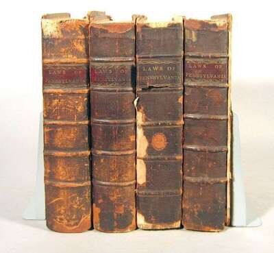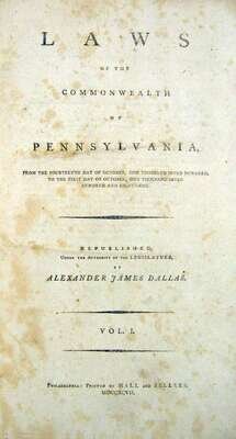 Dallas, Alexander James, editor. Laws of The Commonwealth of Pennsylvania. Philadelphia, 1797, 1793, 1795, 1801. Vols. 1-4. Folio, contemp. calf; rubbed & worn, covers detached but present. Some internal toning & foxing. Vols. 1-3 printed by Hall & Sellers, vol. 4 by Francis Bailey.