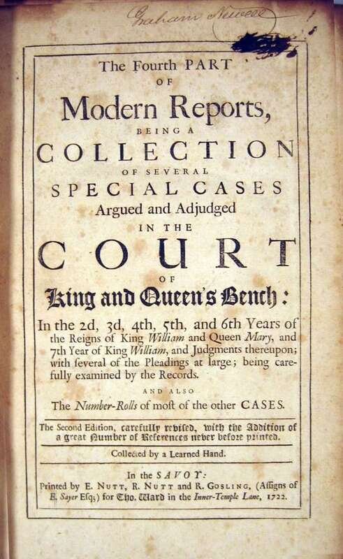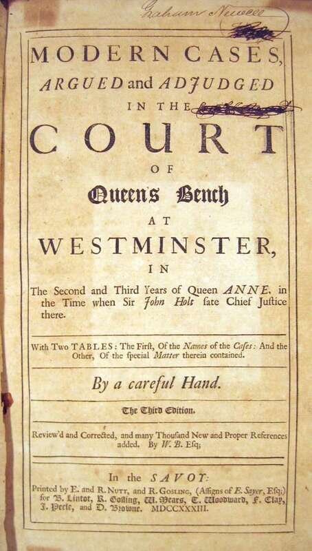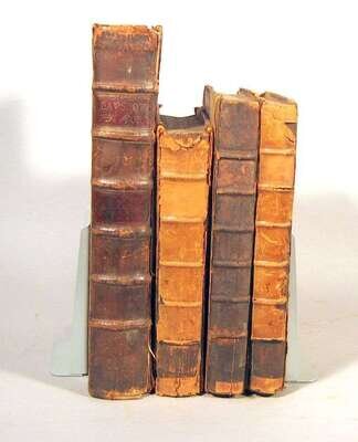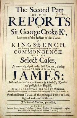 Law: Croke, George. Second Part of The Reports... Select Cases,.. during.. Reign of... King James... London, 1669. Folio, old calf; rubbed & worn. Minor internal foxing. * Fourth Part of Modern Reports... Special Cases,.. in The Court of King and Queen's Bench... (London), in The Savoy: E. Nutt, R. Nutt and R. Gosling, 1722. Folio, old calf; rubbed & worn, front cover detached. Some internal spotting & foxing. * Modern Cases,... The Court of Queen's Bench.... Second and Third Years of Queen Anne. (London), in The Savoy: E. & R. Nutt and R. Gosling, 1733. Folio, old calf; rubbed & worn, front cover detaching. Title toned, scattered light foxing. * Laws of The State of New York. New York: Hugh Gaine, 1789. 2 vols. in 1. Folio, contemp. calf, red morocco spine label; rubbed, worn & dampstained. Some internal dampstaining & chipping - negligible loss of text. Evans 22012.